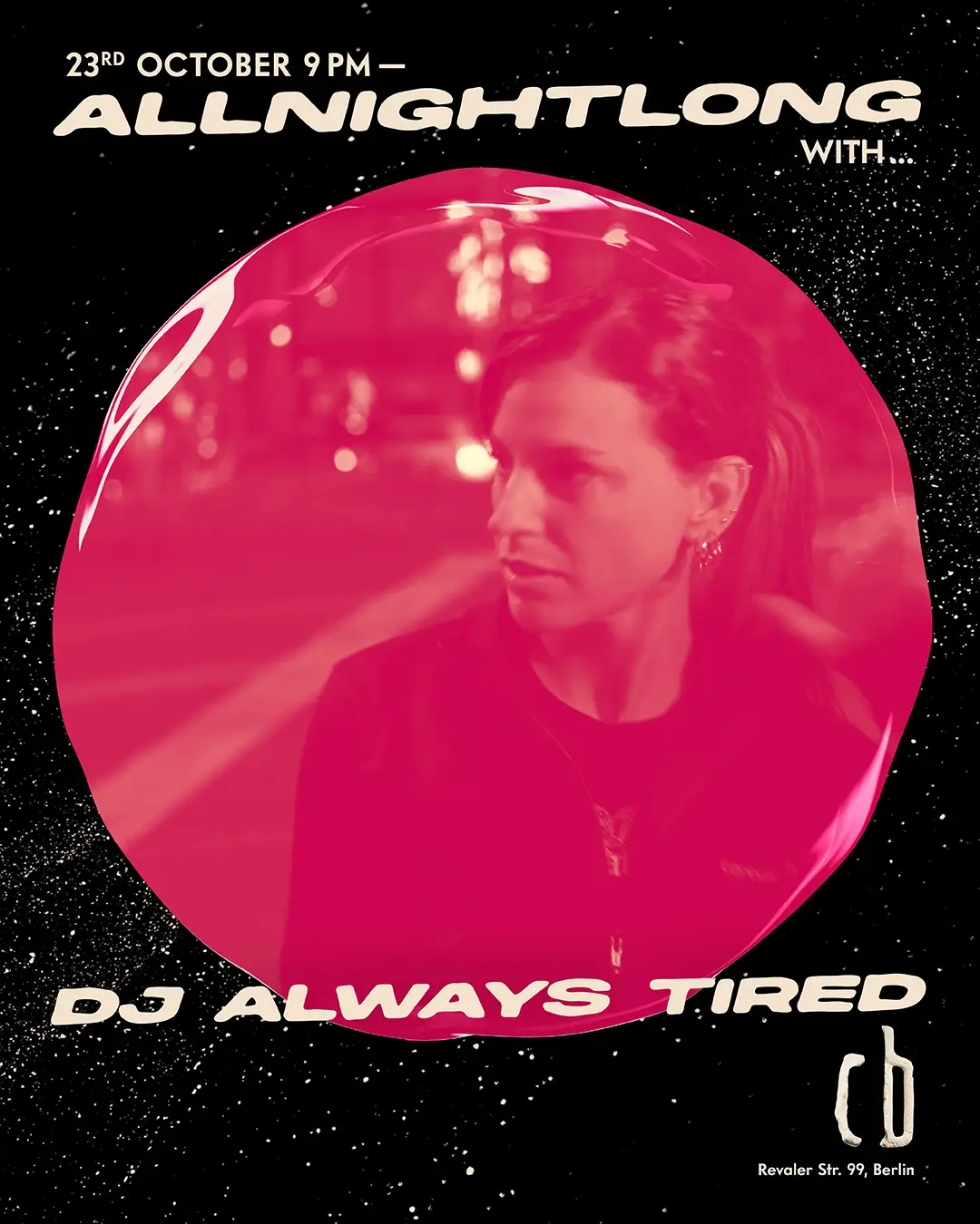 Dj always tired is the moniker of Daiana Platida, a Greek-Romanian DJ and selector based in Berlin, known for her genre-blending, emotionally driven sets that drift between electro, techno, progressive trancey grooves, and ambient —spanning all the way to downtempo trip-hop.