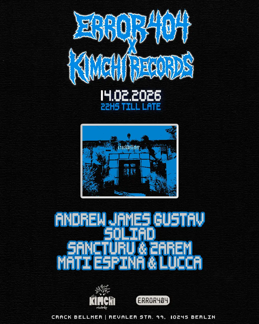 On February 14th, Error 404 x Kimchi Records take over Crack Bellmer for their first Berlin edition. Andrew James Gustav headlines, while Error 404 link up with their longtime crew from Kimchi Records, one of the city’s most respected collectives.